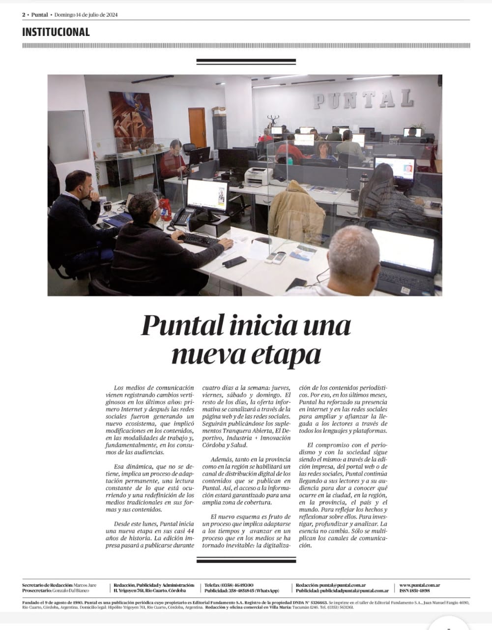 Desde el 15 de julio de 2024, Puntal dejó de ser diario impreso. A través de una carta a sus lectores, titulada “Puntal inicia una nueva etapa”, comunicó que, de manera impresa, el periódico se publicará cuatro días a la semana: de jueves a domingo. Tras 44 años y aduciendo principalmente cambios tecnológicos y de consumo, Puntal ya no será diario impreso.