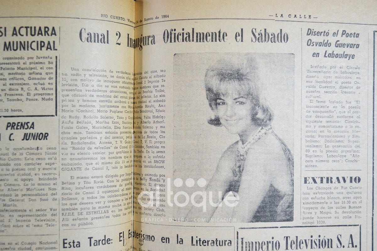 En rigor, los 60 años se cumplieron el último 14 de junio, fecha de la primera emisión. Pero el 15 de agosto de 1964 que se dio formalidad con un evento que agrupó a actrices, actores, empresarios y representantes de Buenos Aires y Córdoba. La actriz Beatriz Taibo fue designada como la madrina del canal. A dos meses de su primera transmisión, el canal ya superaba los 600 abonados al circuito cerrado. Los artículos de los diarios El Pueblo y La Calle (éste último con mayores detalles) dan cuenta de la relevancia de la inauguración del canal local.